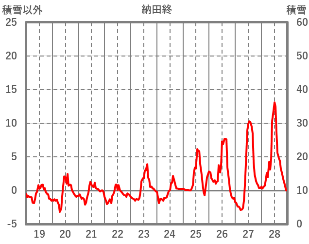 | 日 | 時 | 気温 | 降水 | 風向/風速 | 日照 | 積雪 | 降雪 |
