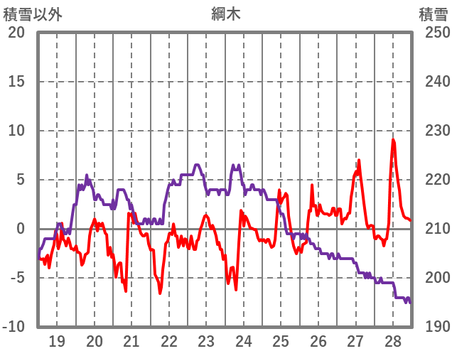 | 日 | 時 | 気温 | 降水 | 風向/風速 | 日照 | 積雪 | 降雪 |