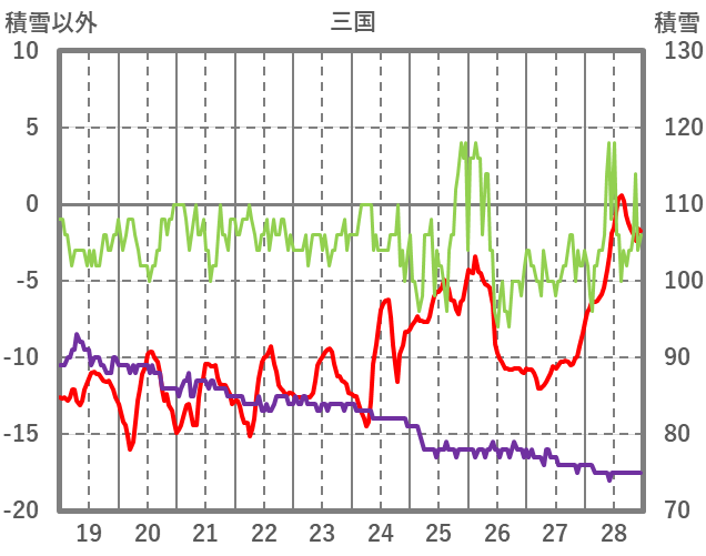 | 日 | 時 | 気温 | 降水 | 風向/風速 | 日照 | 積雪 | 降雪 |