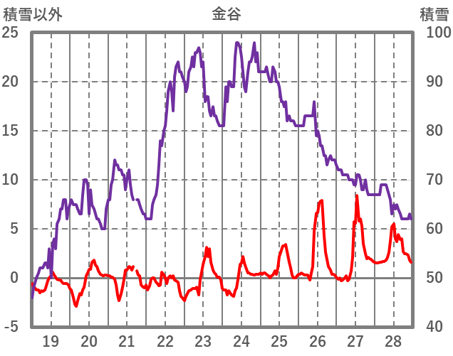 | 日 | 時 | 気温 | 降水 | 風向/風速 | 日照 | 積雪 | 降雪 |