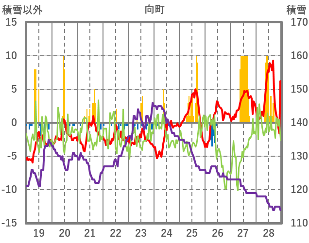 | 日 | 時 | 気温 | 降水 | 風向/風速 | 日照 | 積雪 | 降雪 |