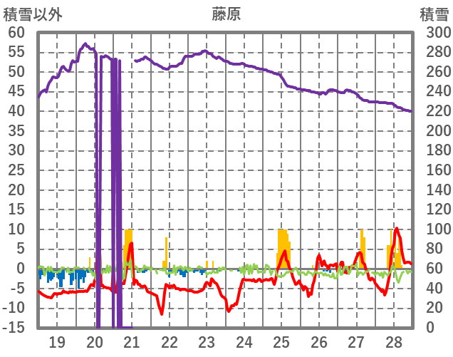| 日 | 時 | 気温 | 降水 | 風向/風速 | 日照 | 積雪 | 降雪 |