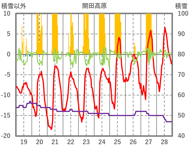 | 日 | 時 | 気温 | 降水 | 風向/風速 | 日照 | 積雪 | 降雪 |