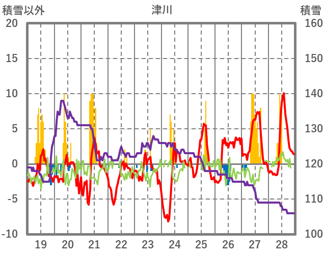 | 日 | 時 | 気温 | 降水 | 風向/風速 | 日照 | 積雪 | 降雪 |