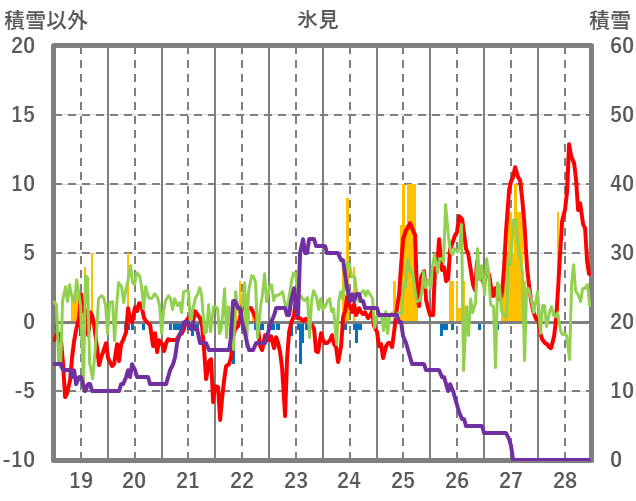 | 日 | 時 | 気温 | 降水 | 風向/風速 | 日照 | 積雪 | 降雪 |