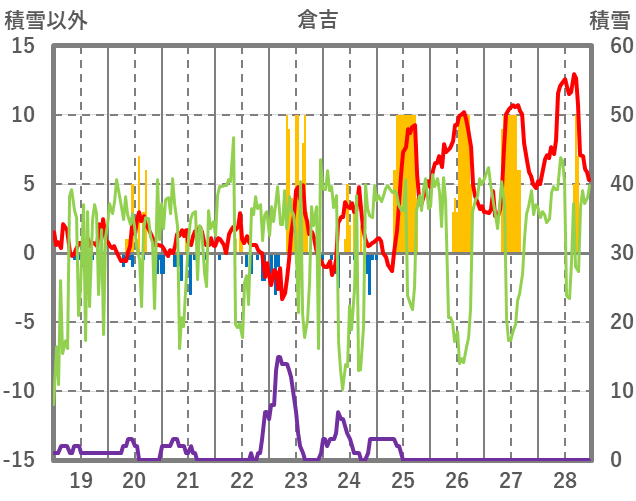 | 日 | 時 | 気温 | 降水 | 風向/風速 | 日照 | 積雪 | 降雪 |