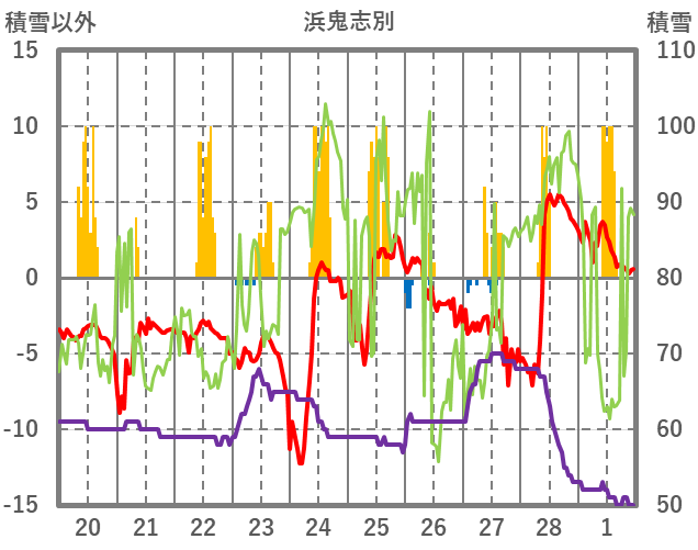 | 日 | 時 | 気温 | 降水 | 風向/風速 | 日照 | 積雪 | 降雪 |