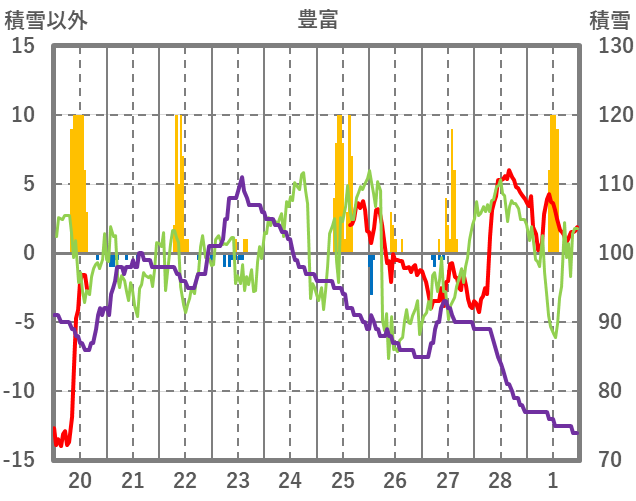 | 日 | 時 | 気温 | 降水 | 風向/風速 | 日照 | 積雪 | 降雪 |