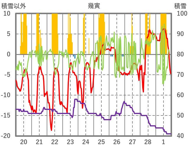 | 日 | 時 | 気温 | 降水 | 風向/風速 | 日照 | 積雪 | 降雪 |