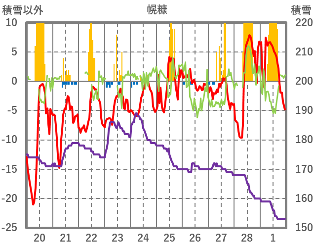 | 日 | 時 | 気温 | 降水 | 風向/風速 | 日照 | 積雪 | 降雪 |
