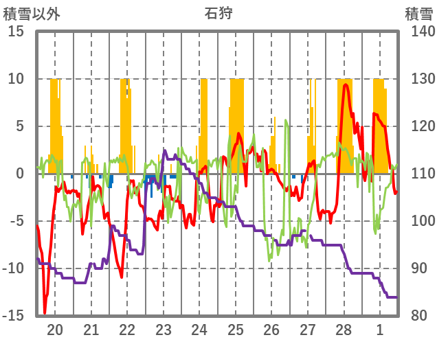 | 日 | 時 | 気温 | 降水 | 風向/風速 | 日照 | 積雪 | 降雪 |