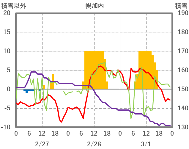 | 日 | 時 | 気温 | 降水 | 風向/風速 | 日照 | 積雪 | 降雪 |