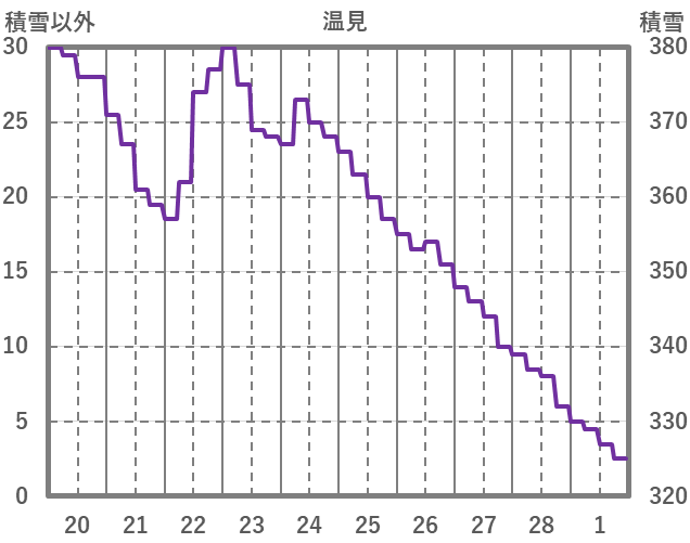 | 日 | 時 | 気温 | 降水 | 風向/風速 | 日照 | 積雪 | 降雪 |