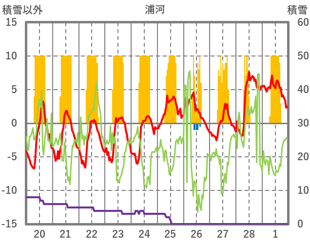 | 日 | 時 | 気温 | 降水 | 風向/風速 | 日照 | 積雪 | 降雪 |