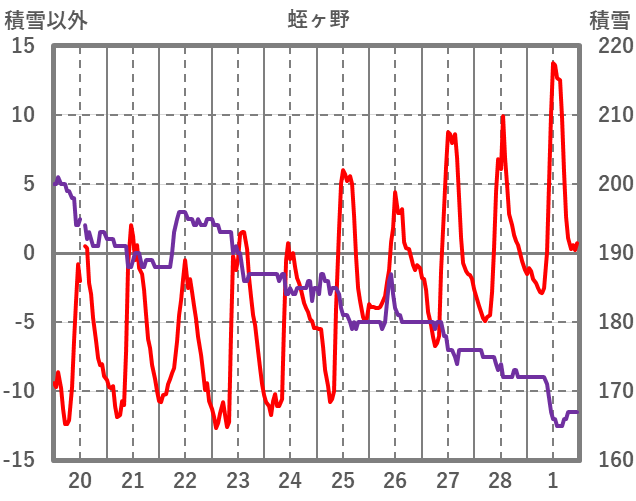 | 日 | 時 | 気温 | 降水 | 風向/風速 | 日照 | 積雪 | 降雪 |