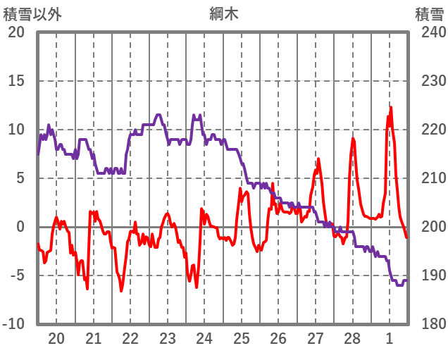 | 日 | 時 | 気温 | 降水 | 風向/風速 | 日照 | 積雪 | 降雪 |