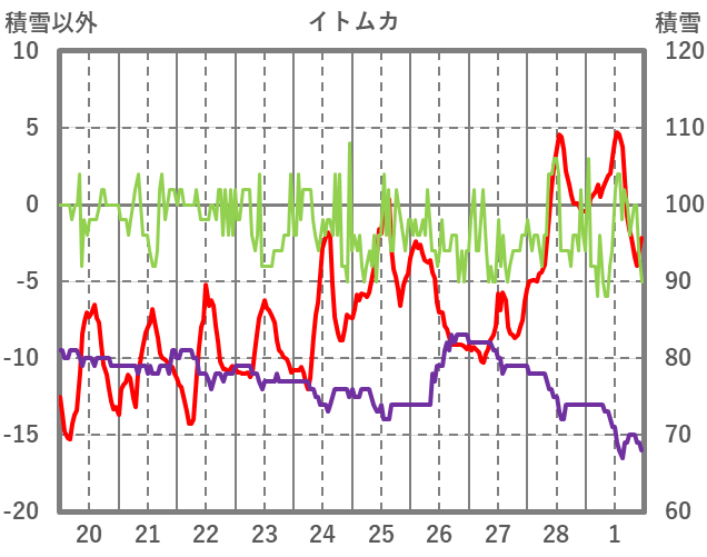 | 日 | 時 | 気温 | 降水 | 風向/風速 | 日照 | 積雪 | 降雪 |