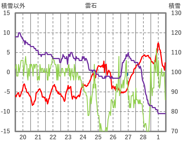 | 日 | 時 | 気温 | 降水 | 風向/風速 | 日照 | 積雪 | 降雪 |
