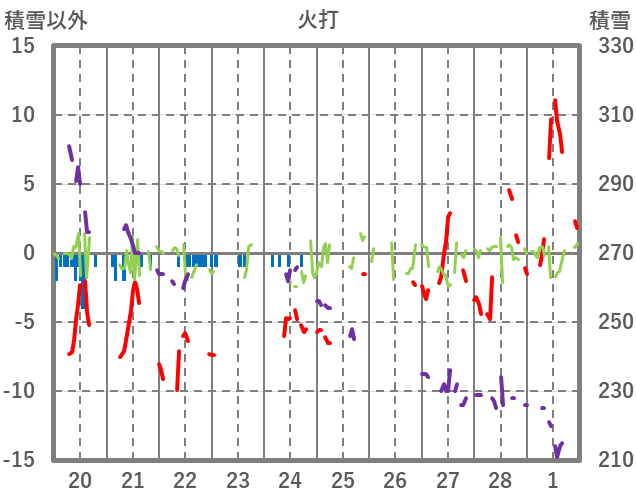 | 日 | 時 | 気温 | 降水 | 風向/風速 | 日照 | 積雪 | 降雪 |