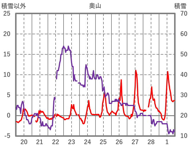 | 日 | 時 | 気温 | 降水 | 風向/風速 | 日照 | 積雪 | 降雪 |