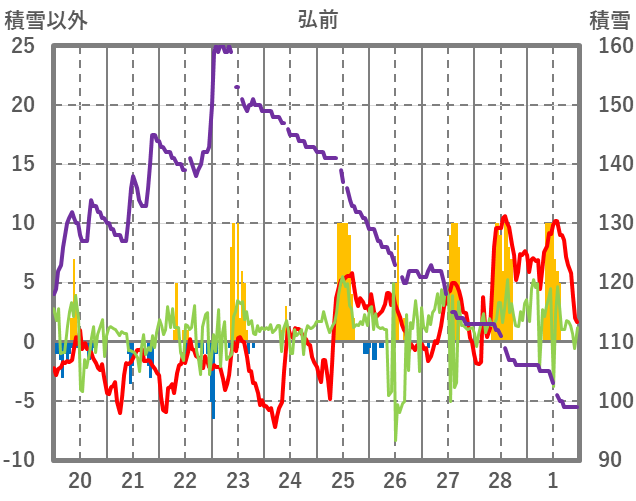| 日 | 時 | 気温 | 降水 | 風向/風速 | 日照 | 積雪 | 降雪 |