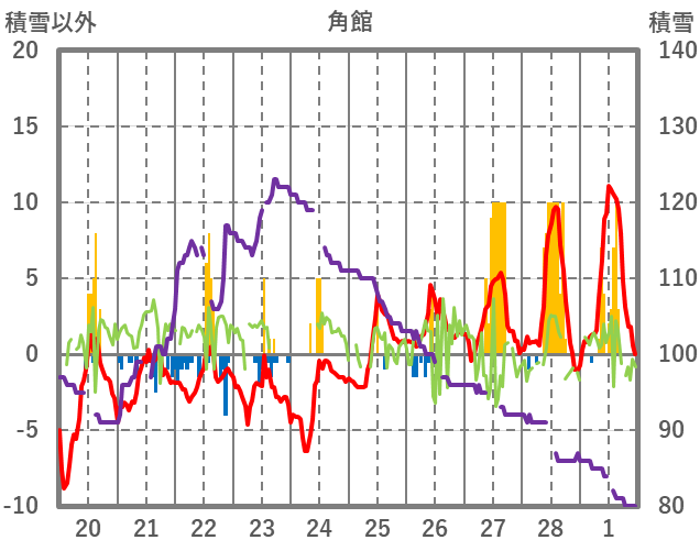 | 日 | 時 | 気温 | 降水 | 風向/風速 | 日照 | 積雪 | 降雪 |