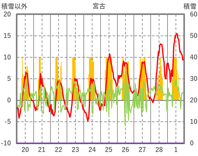 | 日 | 時 | 気温 | 降水 | 風向/風速 | 日照 | 積雪 | 降雪 |