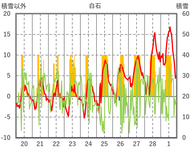 | 日 | 時 | 気温 | 降水 | 風向/風速 | 日照 | 積雪 | 降雪 |