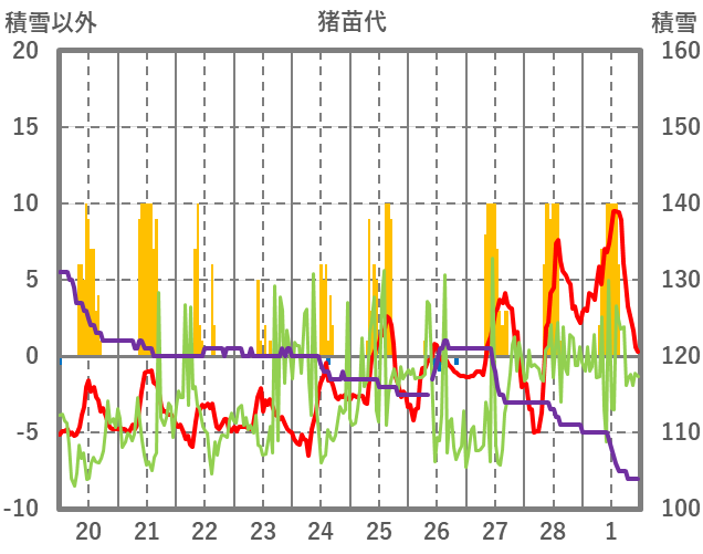 | 日 | 時 | 気温 | 降水 | 風向/風速 | 日照 | 積雪 | 降雪 |
