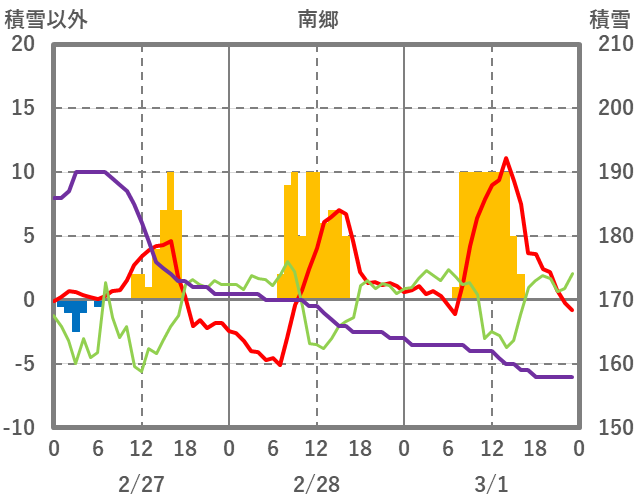 | 日 | 時 | 気温 | 降水 | 風向/風速 | 日照 | 積雪 | 降雪 |