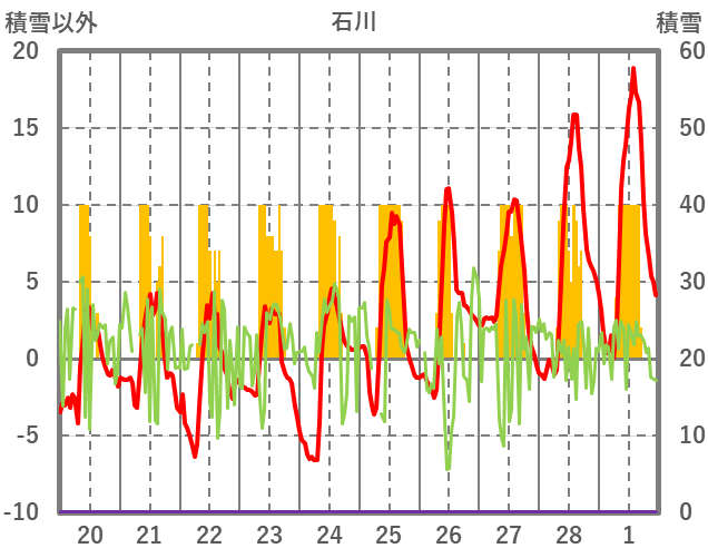 | 日 | 時 | 気温 | 降水 | 風向/風速 | 日照 | 積雪 | 降雪 |