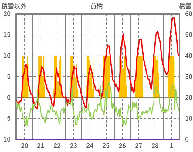 | 日 | 時 | 気温 | 降水 | 風向/風速 | 日照 | 積雪 | 降雪 |