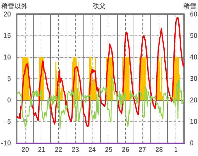 | 日 | 時 | 気温 | 降水 | 風向/風速 | 日照 | 積雪 | 降雪 |