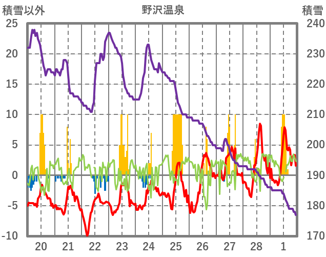 | 日 | 時 | 気温 | 降水 | 風向/風速 | 日照 | 積雪 | 降雪 |