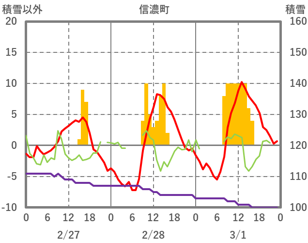 | 日 | 時 | 気温 | 降水 | 風向/風速 | 日照 | 積雪 | 降雪 |