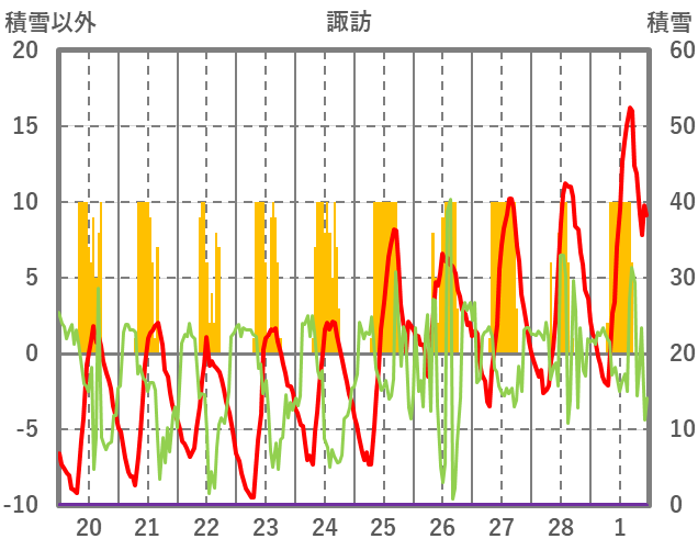 | 日 | 時 | 気温 | 降水 | 風向/風速 | 日照 | 積雪 | 降雪 |