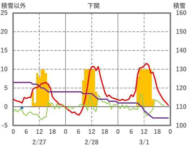 | 日 | 時 | 気温 | 降水 | 風向/風速 | 日照 | 積雪 | 降雪 |