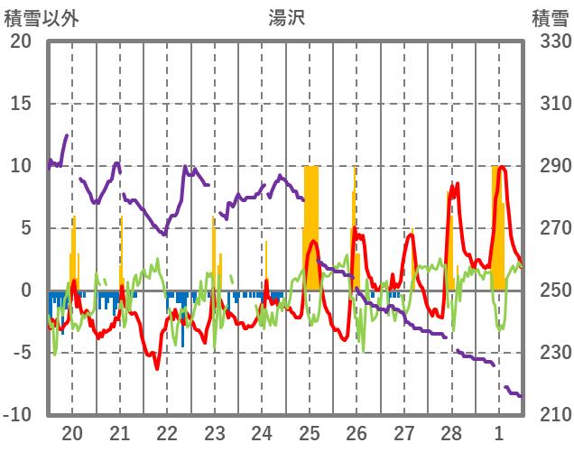 | 日 | 時 | 気温 | 降水 | 風向/風速 | 日照 | 積雪 | 降雪 |