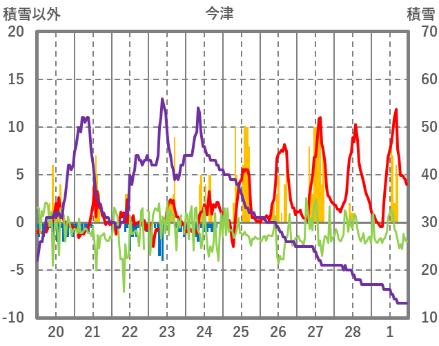 | 日 | 時 | 気温 | 降水 | 風向/風速 | 日照 | 積雪 | 降雪 |