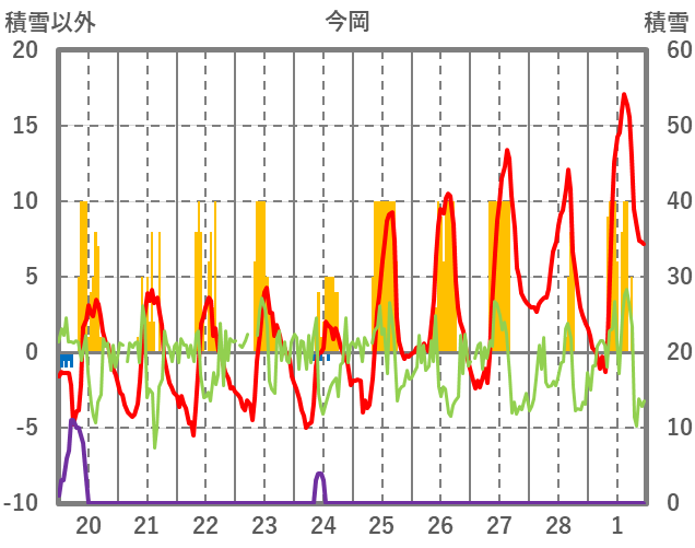 | 日 | 時 | 気温 | 降水 | 風向/風速 | 日照 | 積雪 | 降雪 |