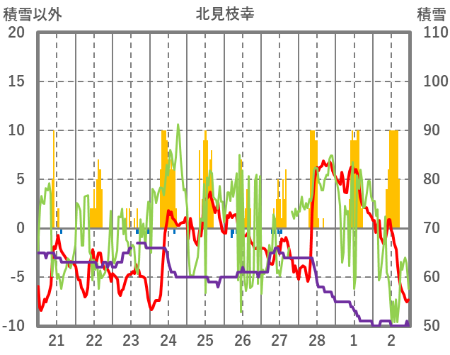 | 日 | 時 | 気温 | 降水 | 風向/風速 | 日照 | 積雪 | 降雪 |