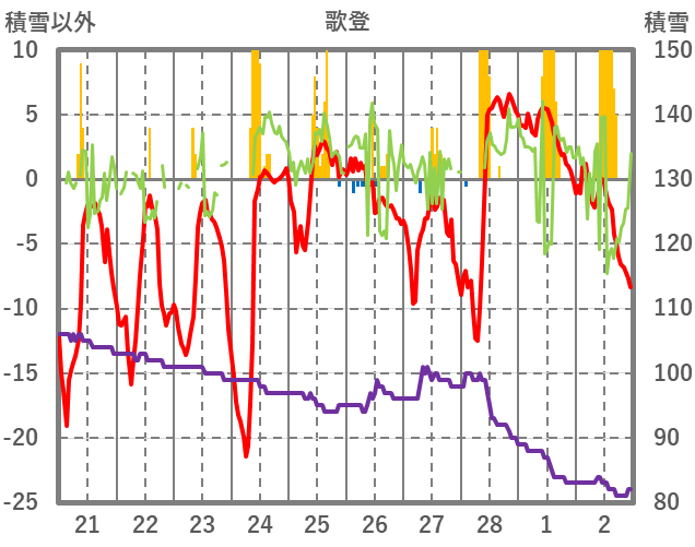 | 日 | 時 | 気温 | 降水 | 風向/風速 | 日照 | 積雪 | 降雪 |