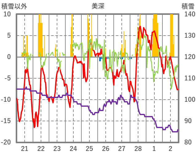 | 日 | 時 | 気温 | 降水 | 風向/風速 | 日照 | 積雪 | 降雪 |