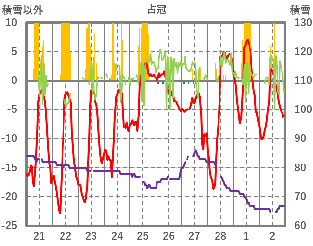 | 日 | 時 | 気温 | 降水 | 風向/風速 | 日照 | 積雪 | 降雪 |