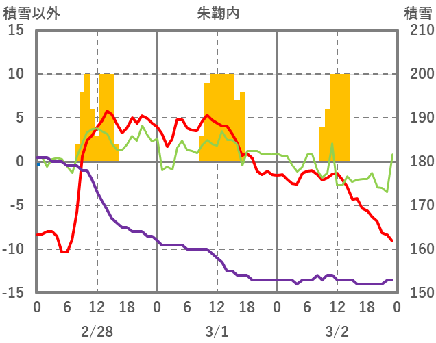 | 日 | 時 | 気温 | 降水 | 風向/風速 | 日照 | 積雪 | 降雪 |