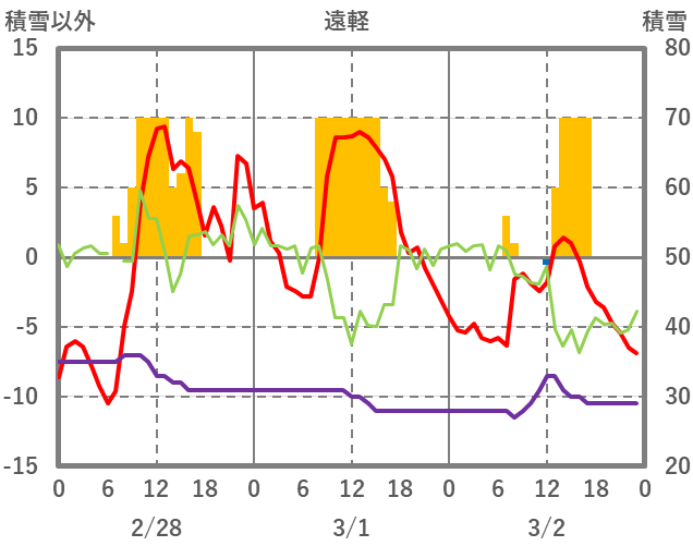 | 日 | 時 | 気温 | 降水 | 風向/風速 | 日照 | 積雪 | 降雪 |