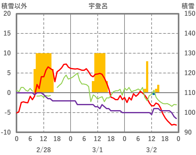 | 日 | 時 | 気温 | 降水 | 風向/風速 | 日照 | 積雪 | 降雪 |