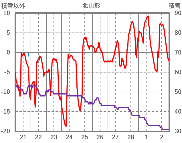 | 日 | 時 | 気温 | 降水 | 風向/風速 | 日照 | 積雪 | 降雪 |