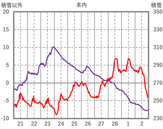 | 日 | 時 | 気温 | 降水 | 風向/風速 | 日照 | 積雪 | 降雪 |