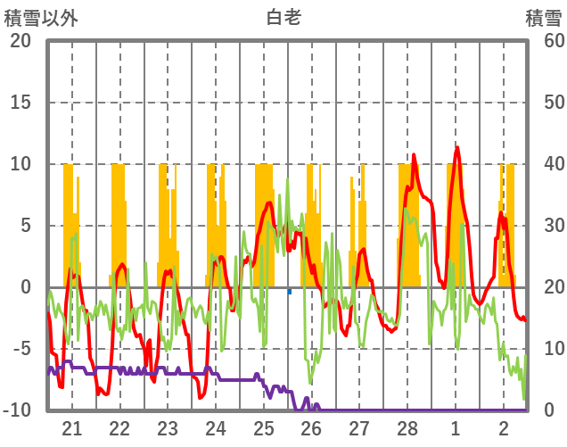 | 日 | 時 | 気温 | 降水 | 風向/風速 | 日照 | 積雪 | 降雪 |